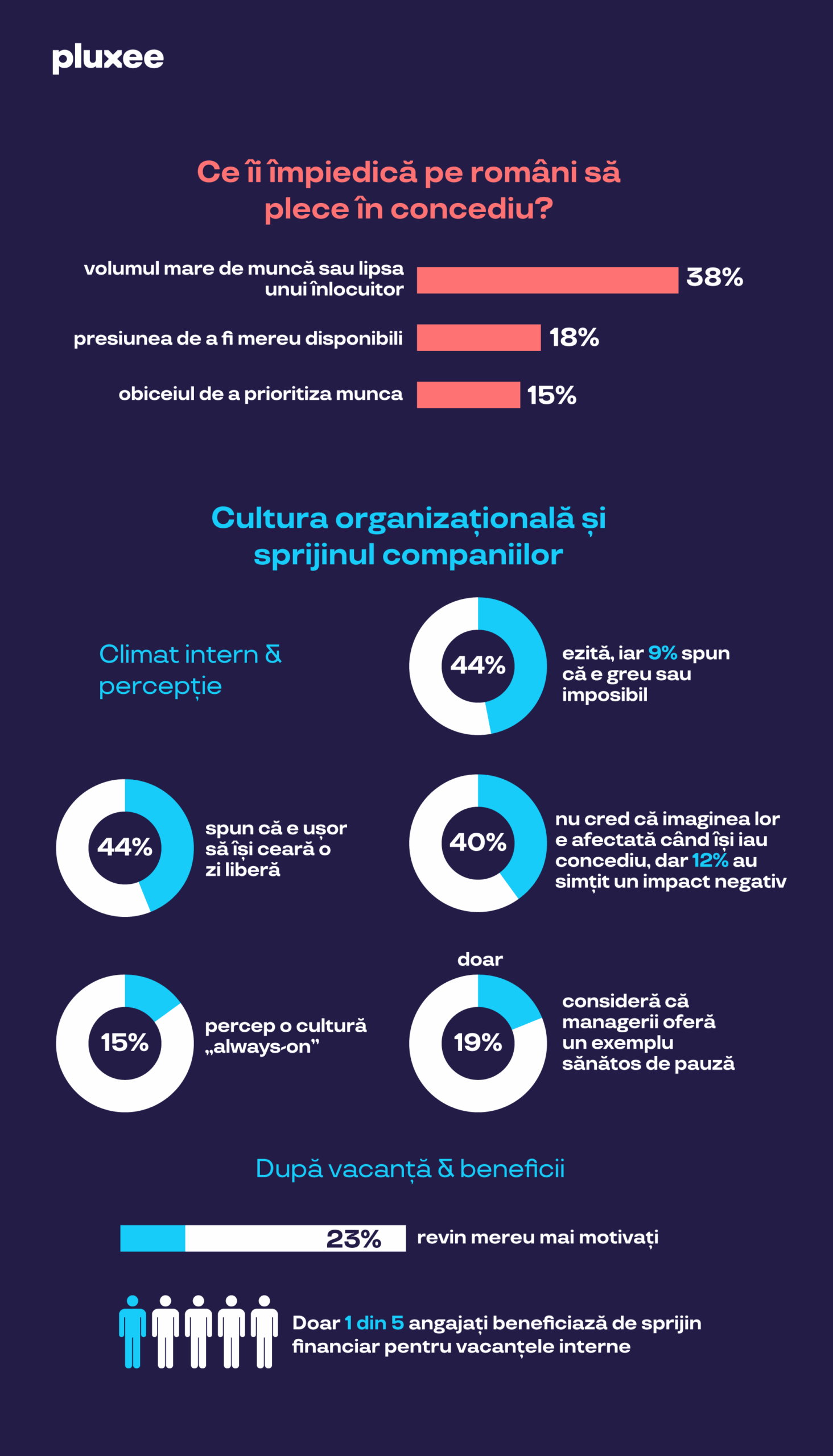 Printre principalele obstacole care îi împiedică pe angajați să își ia concediul de odihnă se află volumul mare de muncă și lipsa unui înlocuitor, menționate de 38% dintre respondenți. Pentru alți 18%, presiunea de a fi mereu disponibili joacă un rol important, iar 15% spun că au obiceiul de a pune munca pe primul loc, chiar și atunci când ar avea ocazia să se odihnească.
